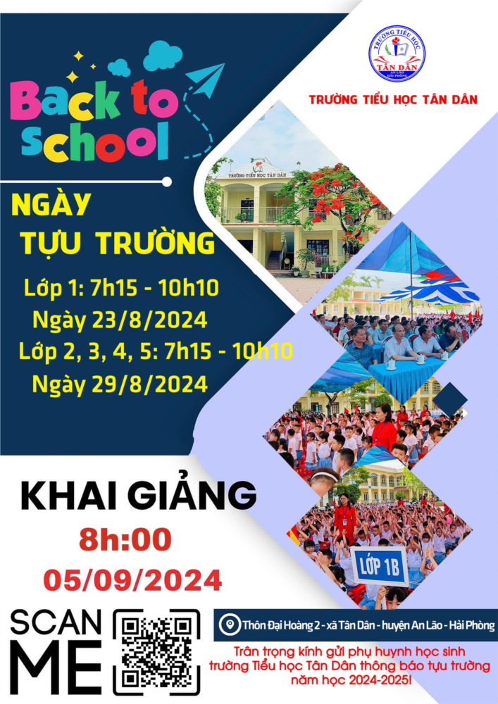 Trường Tiểu học Tân Dân xin thông báo lịch tựu trường cho các em học sinh năm học 2024-2025 như sau: