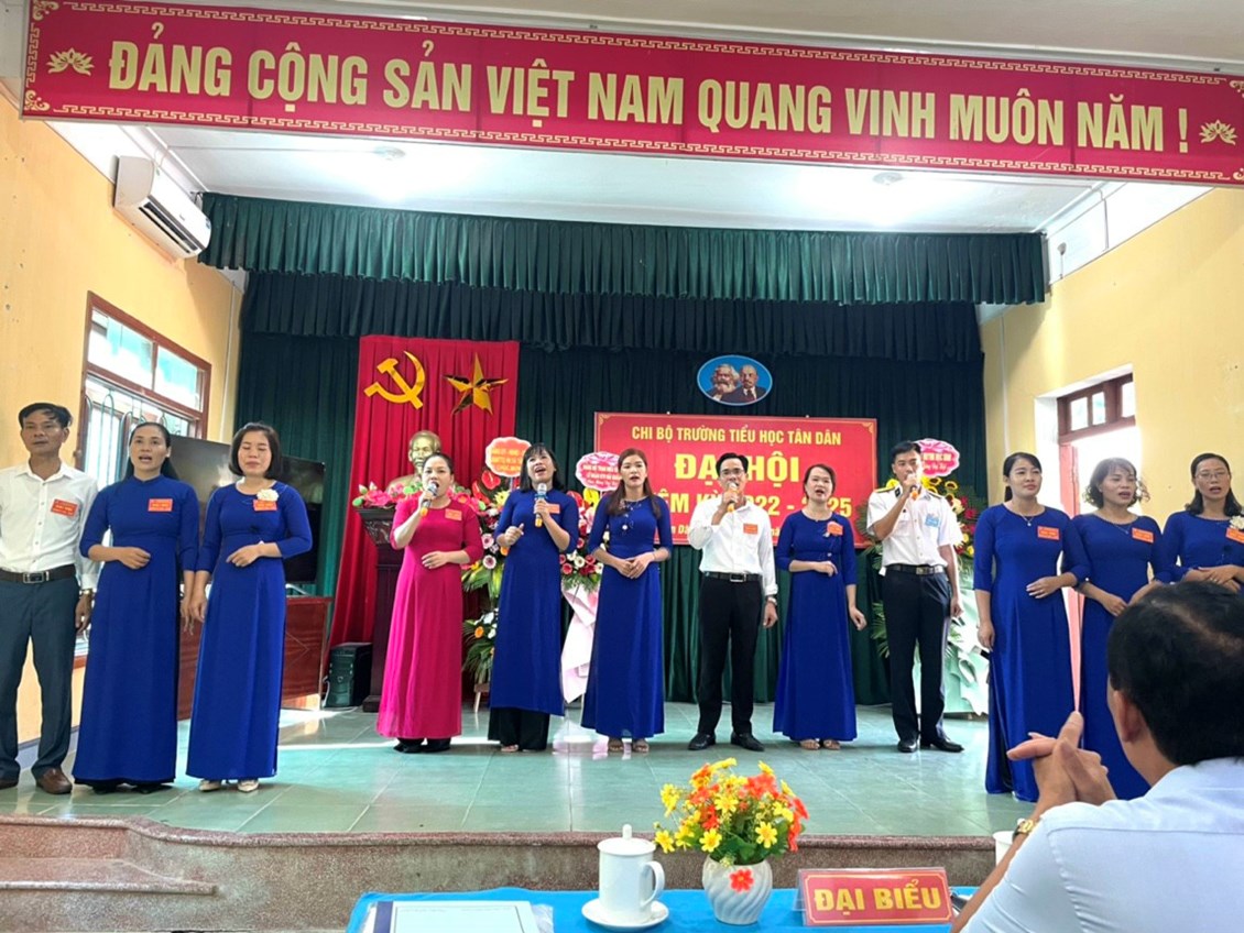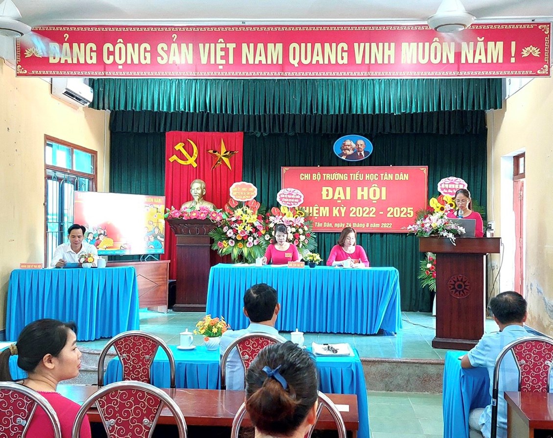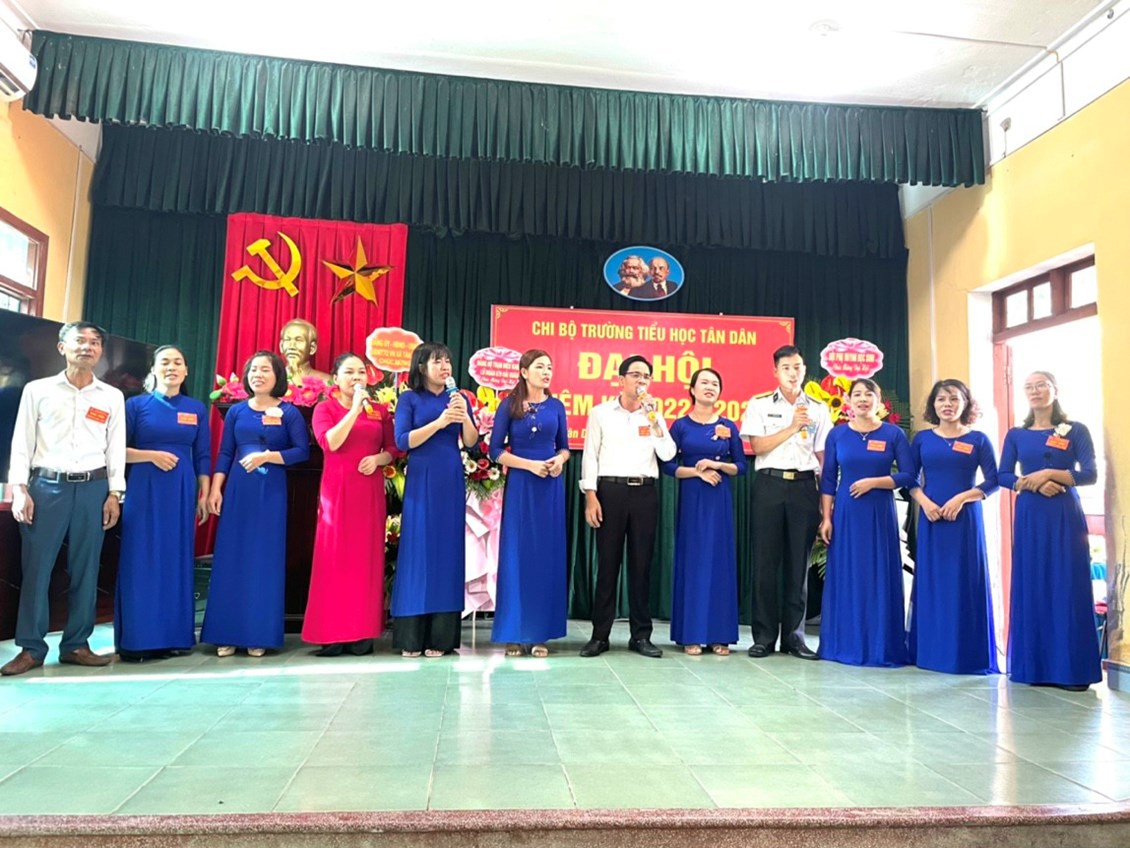 Thực hiện Kế hoạch số 04-KH/ĐU ngày 02/6/2022 của Đảng uỷ xã Tân Dân về kế hoạch tổ chức Đại hội nhiệm kỳ 2022-2025. Hôm nay, ngày 24/8/2022 chi bộ trường Tiểu học Tân Dân long trọng tổ chức Đại hội chi bộ nhiệm kỳ 2022-2025. Đại hội đánh giá kết quả thực hiện Nghị quyết Đại hội nhiệm kỳ 2020-2022, đề ra phương hướng, nhiệm vụ, giải pháp nhiệm kỳ 2022-2025 và bầu Chi uỷ chi bộ, Bí thư, Phó Bí thư chi bộ nhiệm kỳ 2022-2025. Trân trọng cảm ơn các đồng chí lãnh đạo, các đồng chí trong đoàn công tác của BTV Đảng uỷ xã đã về dự và chỉ đạo ĐH, cảm ơn các đ/c chỉ huy trạm Điều khiển- Lữ đoàn 679 Hải Quân, đại diện CMHS đã đến dự và chúc mừng ĐH!