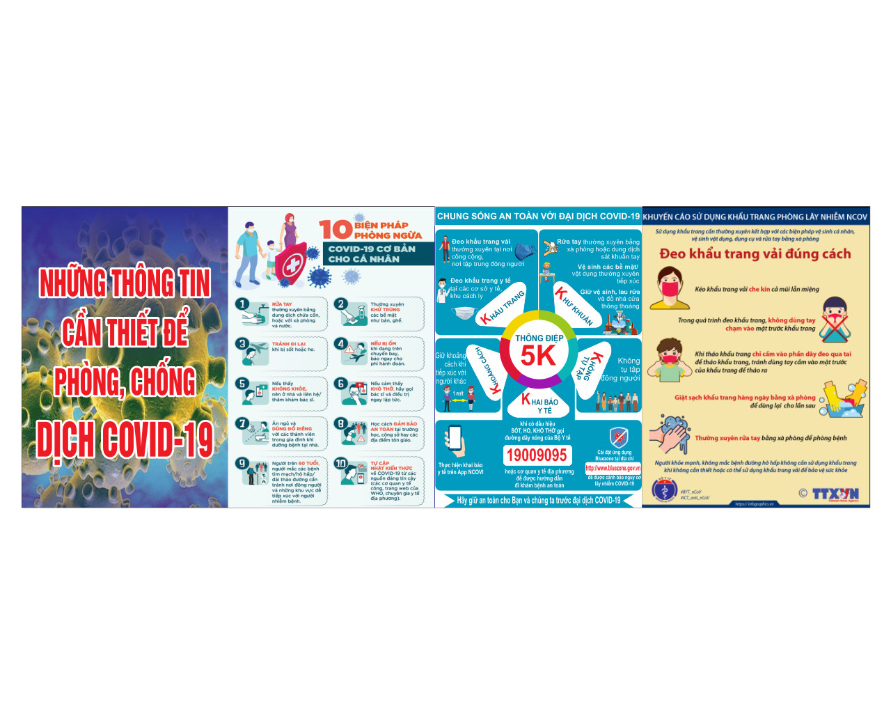 - Dán các hình ảnh, bích chương/áp phích truyền thông như thông điệp 5K, Các thời điểm cần rửa sạch đôi tay, Hướng dẫn đeo khẩu trang đúng cách…. tại các khu vực dễ nhìn.