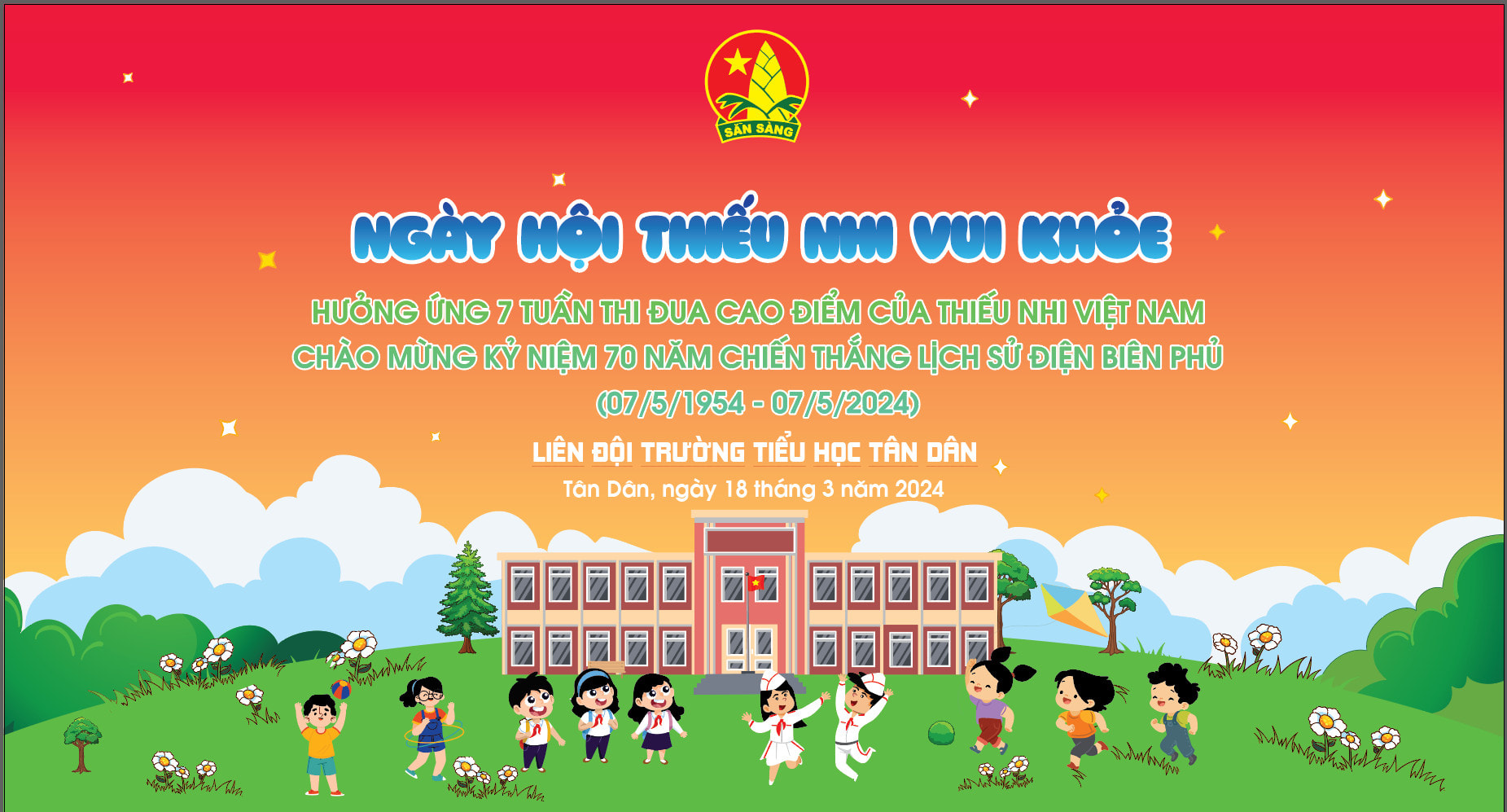 7/5/1954 – 7/5/2024), thực hiện kế hoạch số 44 – KH/ĐTN tổ chức ngày hội Thiếu nhi vui khoẻ - Tiến bước lên Đoàn; Sáng nay ngày 18/3/2024 Liên đội trường Tiểu học Tân Dân tổ chức Ngày hội thiếu nhi vui khoẻ- hưởng ứng 7 tuần thi đua cao điểm của thiếu nhi Việt Nam chào mừng kỷ niệm 70 năm chiến thắng lịch sử Điện Biên Phủ ( 07/5/1954- 07/5/2024);