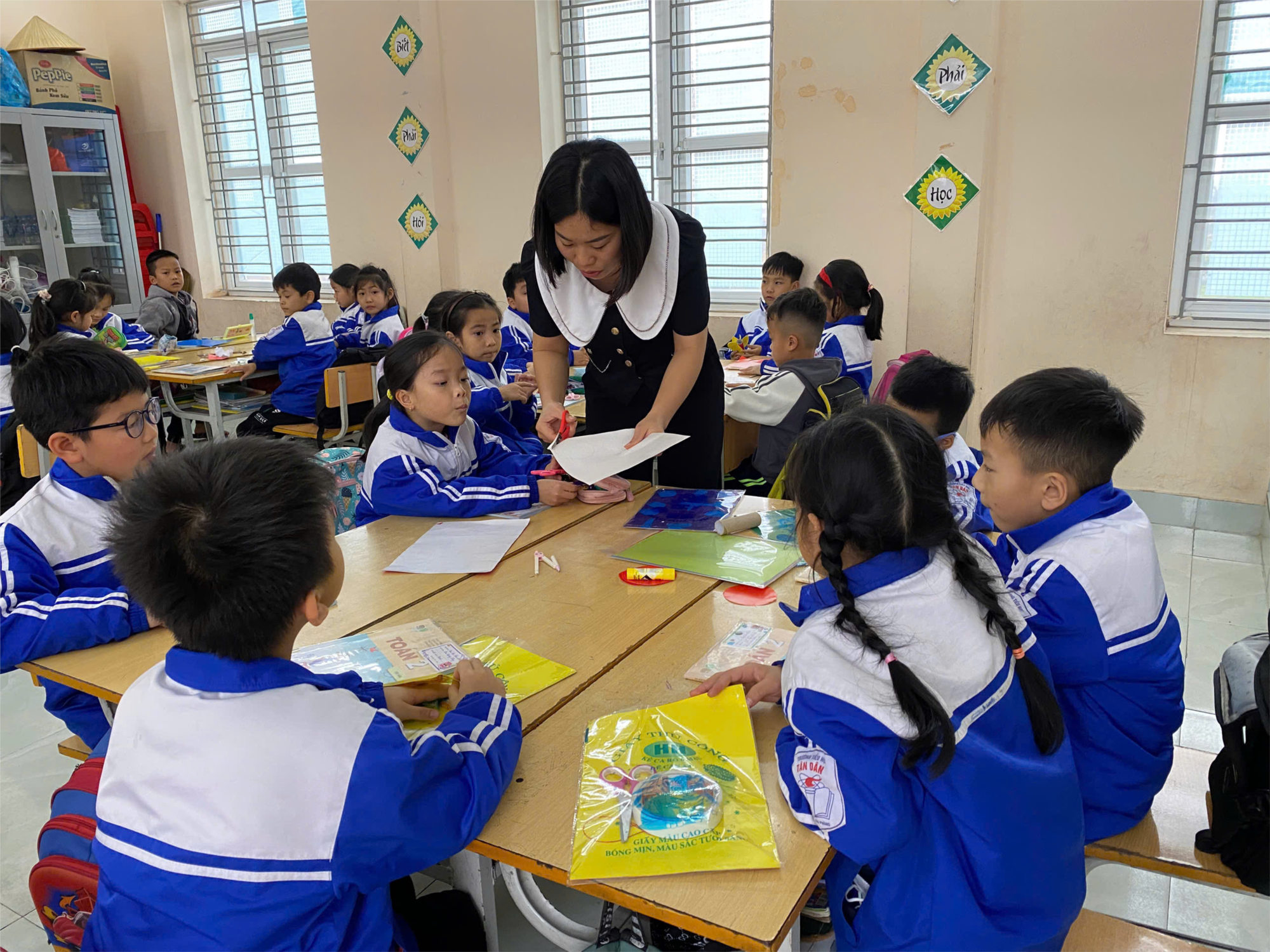Thực hiện kế hoạch CM tháng 2, chiều 18/2/2025, Tổ 2 đã lên chuyên đề môn Toán với bài học STEM "Khối trụ, khối cầu"-Tiết 2- do cô giáo Vũ Thị Huyền thể hiện. Bài học STEM “Khối trụ, khối cầu” được xây dựng dựa trên các đồ dùng, dụng cụ học tập có sẵn cùng với các vật liệu, vật dụng dễ tìm, dễ thấy ngay trong lớp học, trong nhà trường, trong gia đình để các em hợp tác với bạn tạo ra được các sản phẩm từ việc vận dụng các kiến thức của bài học ở trên lớp. Các bạn nhỏ được vận dụng linh hoạt kiến thức vừa học để cùng nhau thảo luận đưa ra đề xuất, lựa chọn giải pháp chế tạo sản phẩm là chiếc đèn lồng từ các đồ dùng, dụng cụ học tập bản thân mình đã dày công chuẩn bị như : lõi giấy vệ sinh có độ dày khác nhau, băng dính 2 mặt, giấy màu, keo, kéo, bút chì, thước kẻ...Khép lại tiết học là hoạt động vô cùng thú vị, các “nhà hùng biện nhí” được thỏa sức thuyết trình về các sản phẩm độc đáo và sáng tạo của nhóm mình trước cả lớp và các thầy cô giáo. Những tràng pháo tay cổ vũ giòn giã và tiếng cười sảng khoái sau mỗi phần thuyết trình là món quà vô giá các bạn nhỏ nhận được. Sau tiết dạy STEM, mỗi giáo viên lại thêm một lần truyền cho nhau niềm đam mê, tinh thần học hỏi để giúp nhau tiến bộ hơn. Mỗi tiết học sẽ ngày càng thú vị, bổ ích hơn, giúp các em học sinh đạt được kết quả tốt và nâng cao chất lượng dạy - học môn Toán.