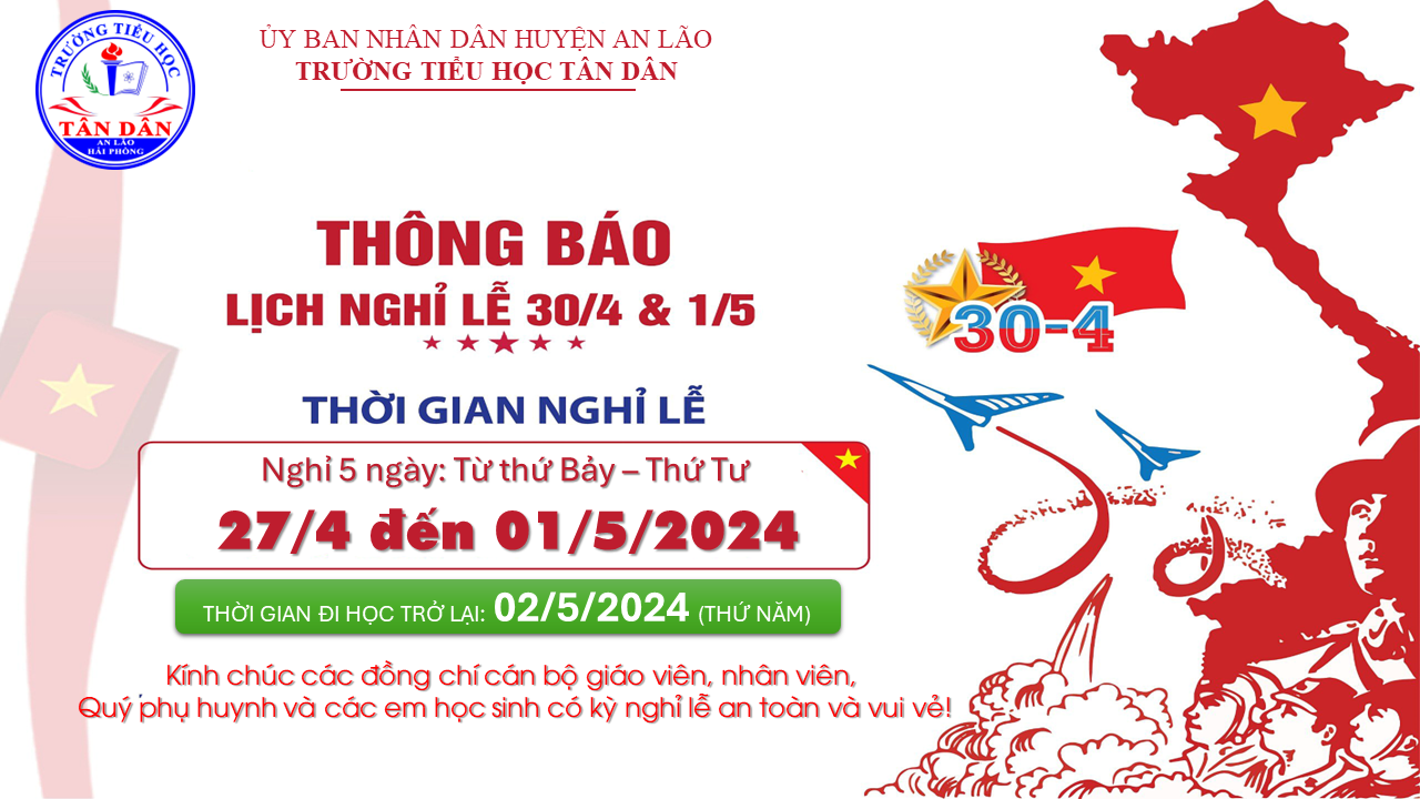 Trường Tiểu học Tân Dân trân trọng gửi tới toàn thể CBGVNV, quý Phụ huynh và các em HS lịch nghỉ Lễ Giải phóng Miền Nam thống nhất đất nước 30/4 và Quốc tế Lao động 1/5. Kính chúc các thầy, cô giáo, các bậc PH, các em HS và gia đình có kì nghỉ lễ vui vẻ, an toàn, ý nghĩa.